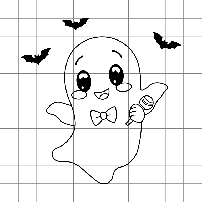 Practice drawing with this trace-by-image sheet of the cute ghost! Follow the clear outline to replicate the ghost’s joyful features, including its bowtie, candy, and flying bats. It’s a great way to improve drawing skills while enjoying a fun Halloween-inspired project.