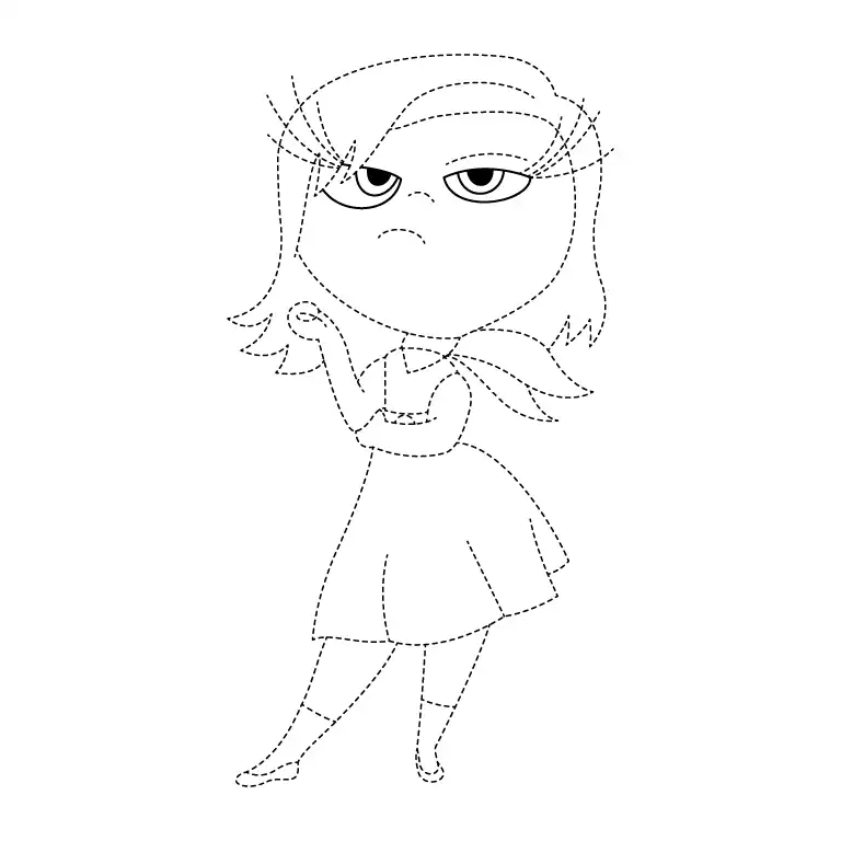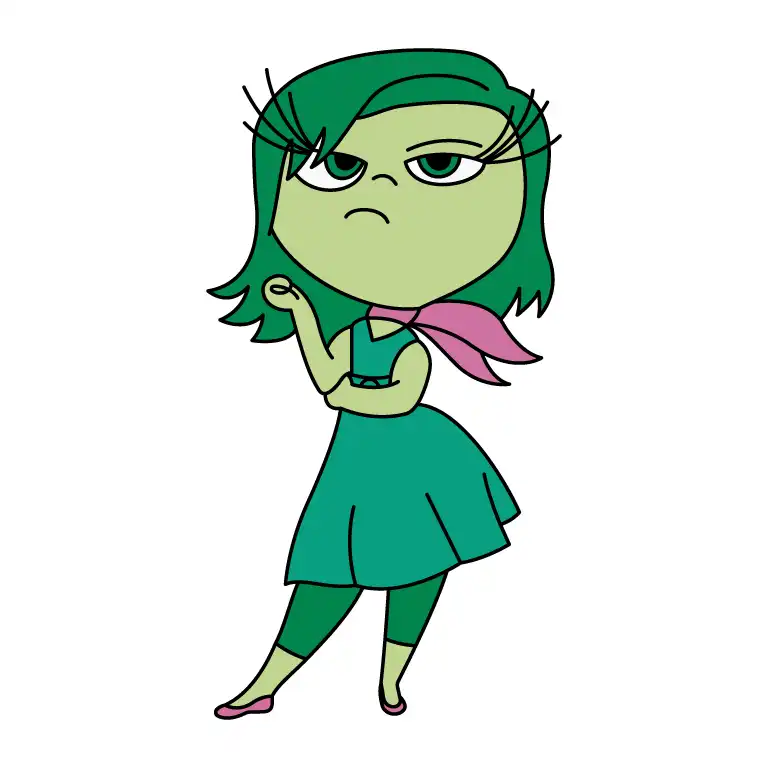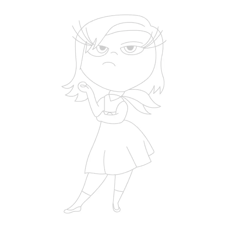 Sketch the outline of Disgust’s stylish hair. Draw it flowing to one side, with sharp, angular strands framing her face. Then draw a skirt extending from her hands.