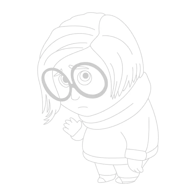 Sketch Sadness’s hair flowing gently over the sides of her head. Her hair is short and wavy, with strands slightly covering the top of the glasses.